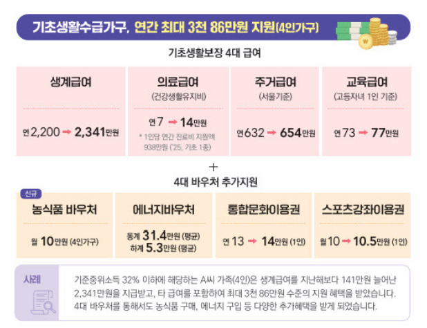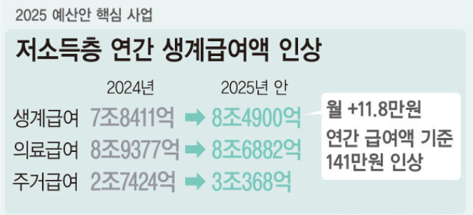 국무회의에서 의결된 예산안에 따르면, 기초생활수급자의 생계급여는 지난 해 대비 141만 원 인상되며, 이는 최근 3년간 평균 인상액이 166만 원에 달해 이전 5년 평균의 3배를 넘깁니다. 장애인, 노인, 한부모 가정 등 취약계층에 대한 맞춤형 지원도 강화됩니다.